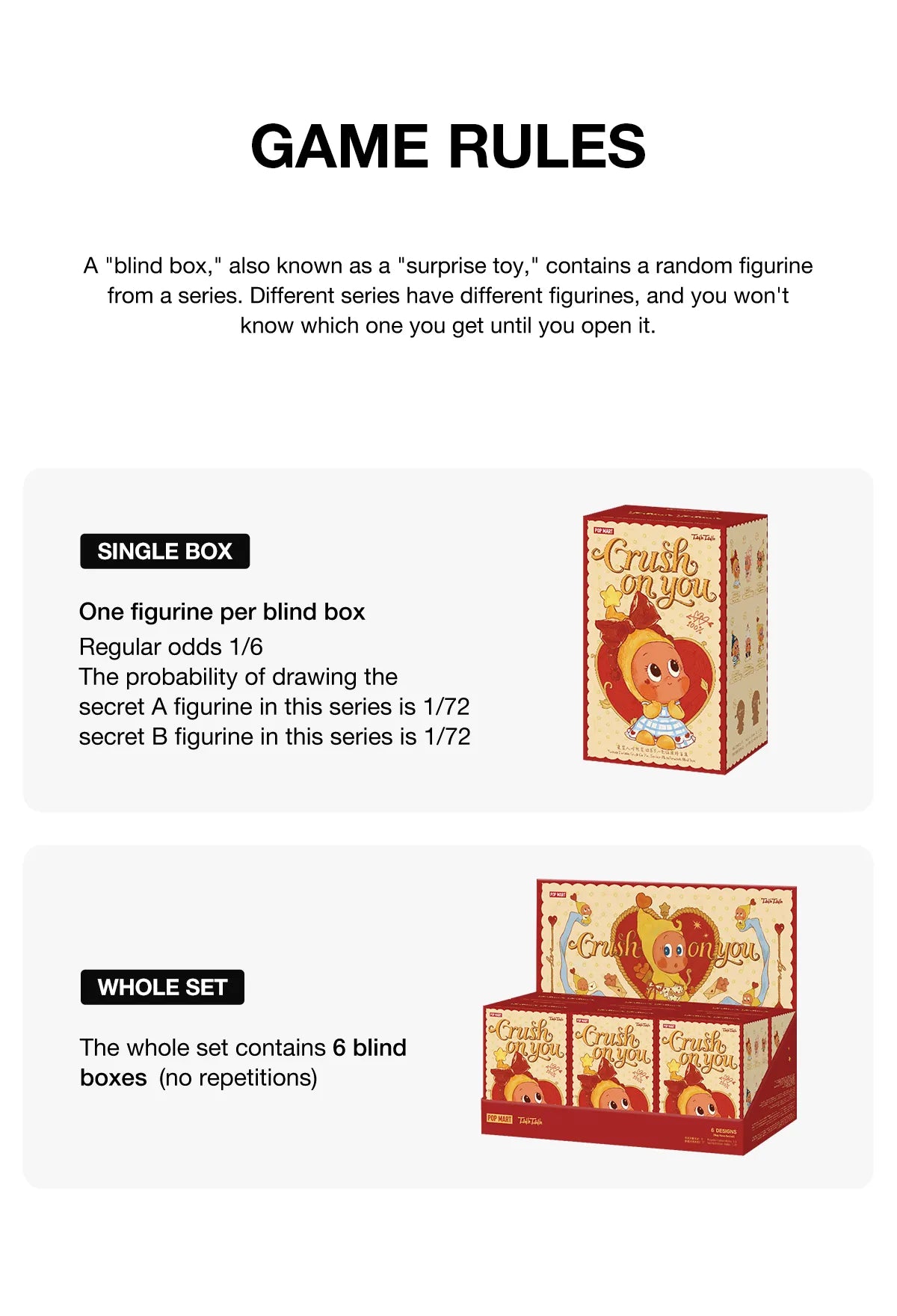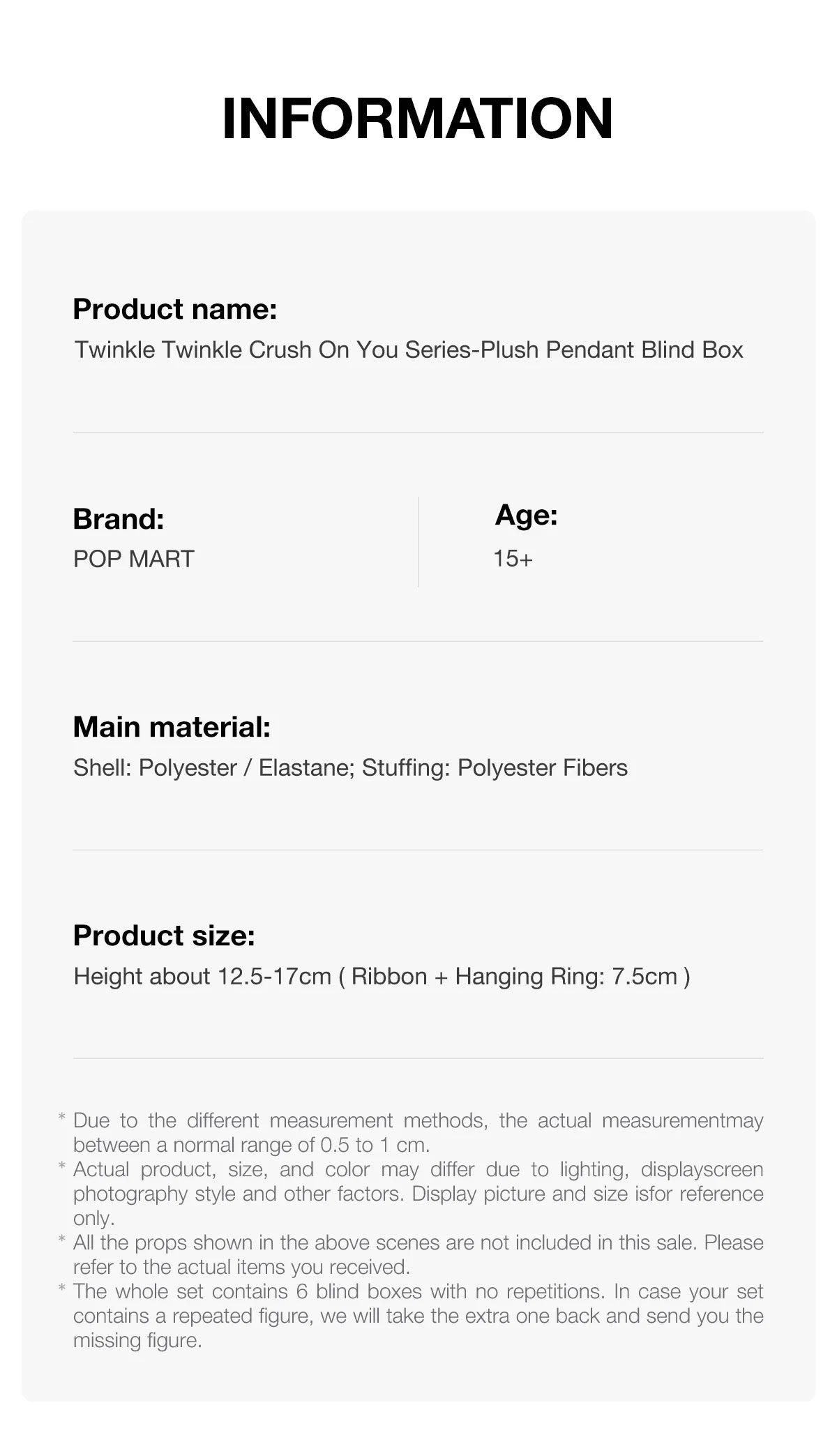 * Cały zestaw zawiera 6 blind boxów bez powtórzeń. Jeśli w zestawie trafi się powtarzająca figurka, dodatkowa zostanie odebrana i zostanie wysłana brakująca figurka.