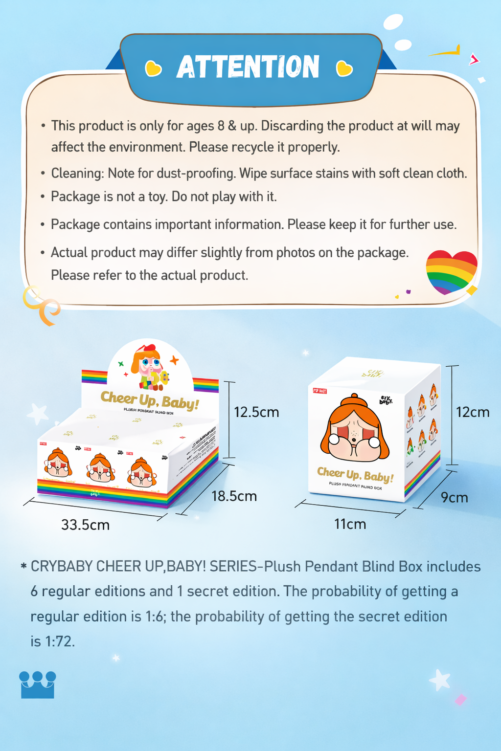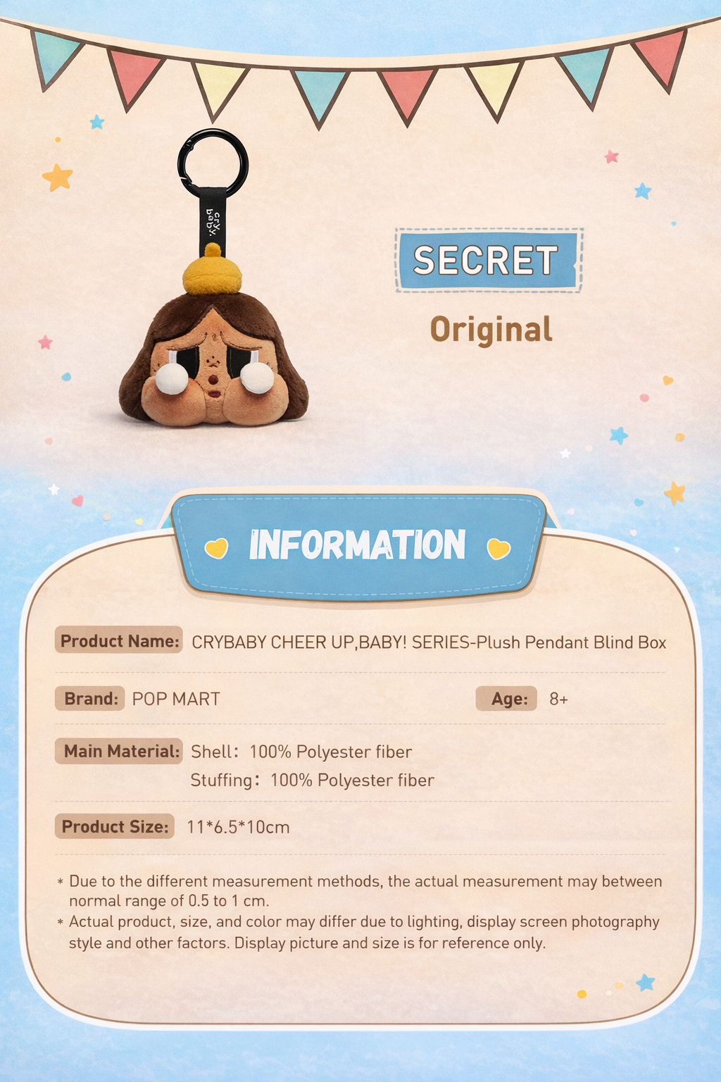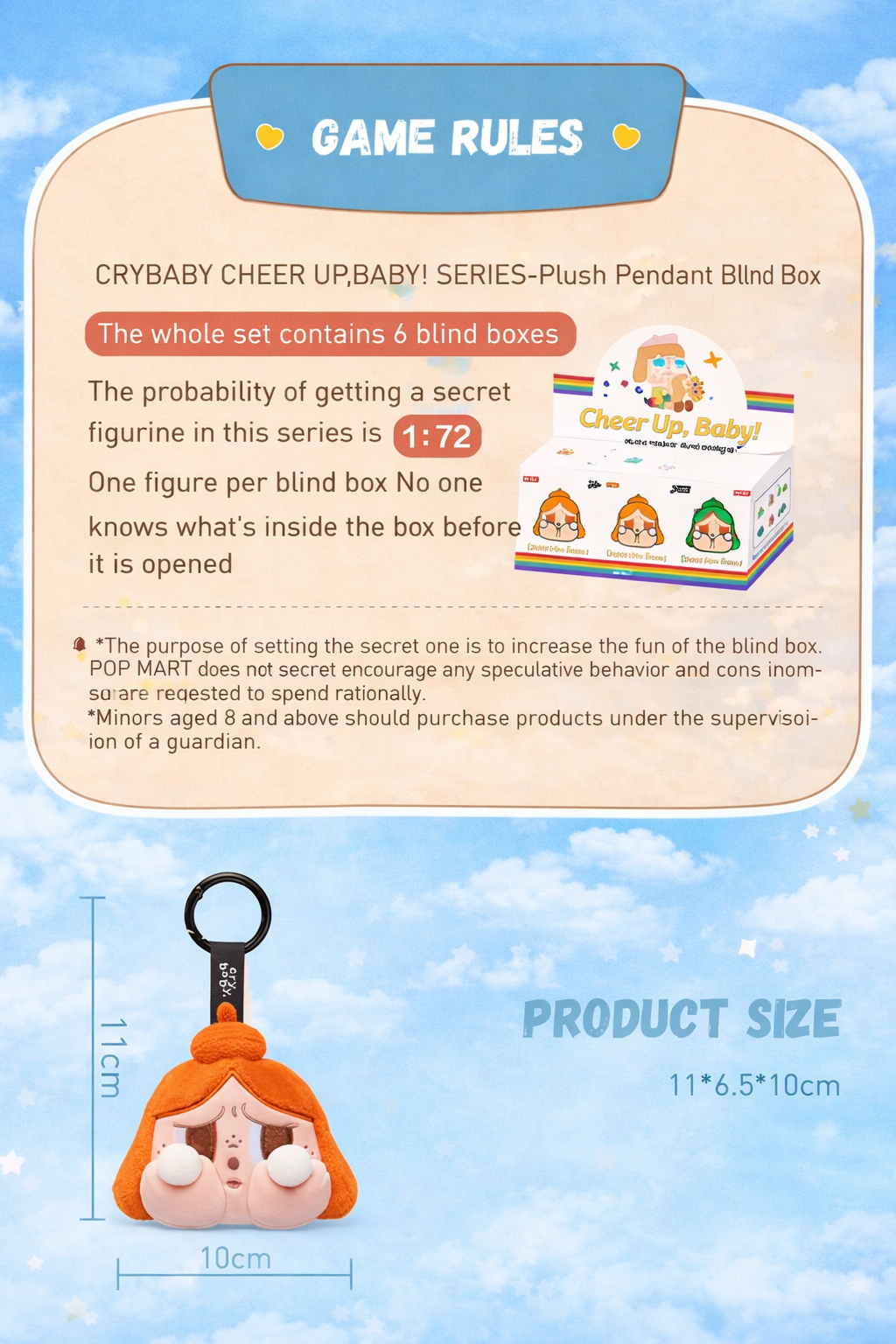 Seria CRYBABY CHEER UP BABY pluszowy brelok Blind Box obejmuje 6 wersji regularnych oraz 1 wersję sekretną.