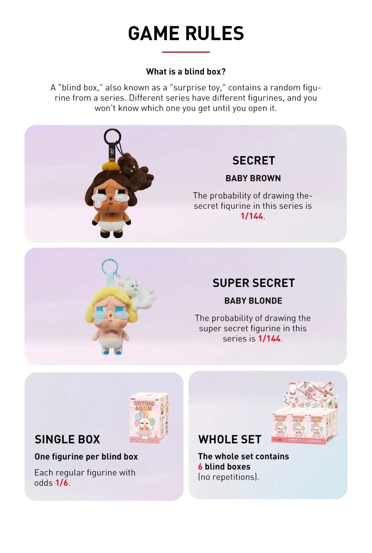 * Cały zestaw zawiera 6 blind boxów bez powtórzeń. Jeśli w Twoim zestawie trafi się powtarzająca figurka, zostanie ona odebrana, a brakująca figurka zostanie do Ciebie dosłana.