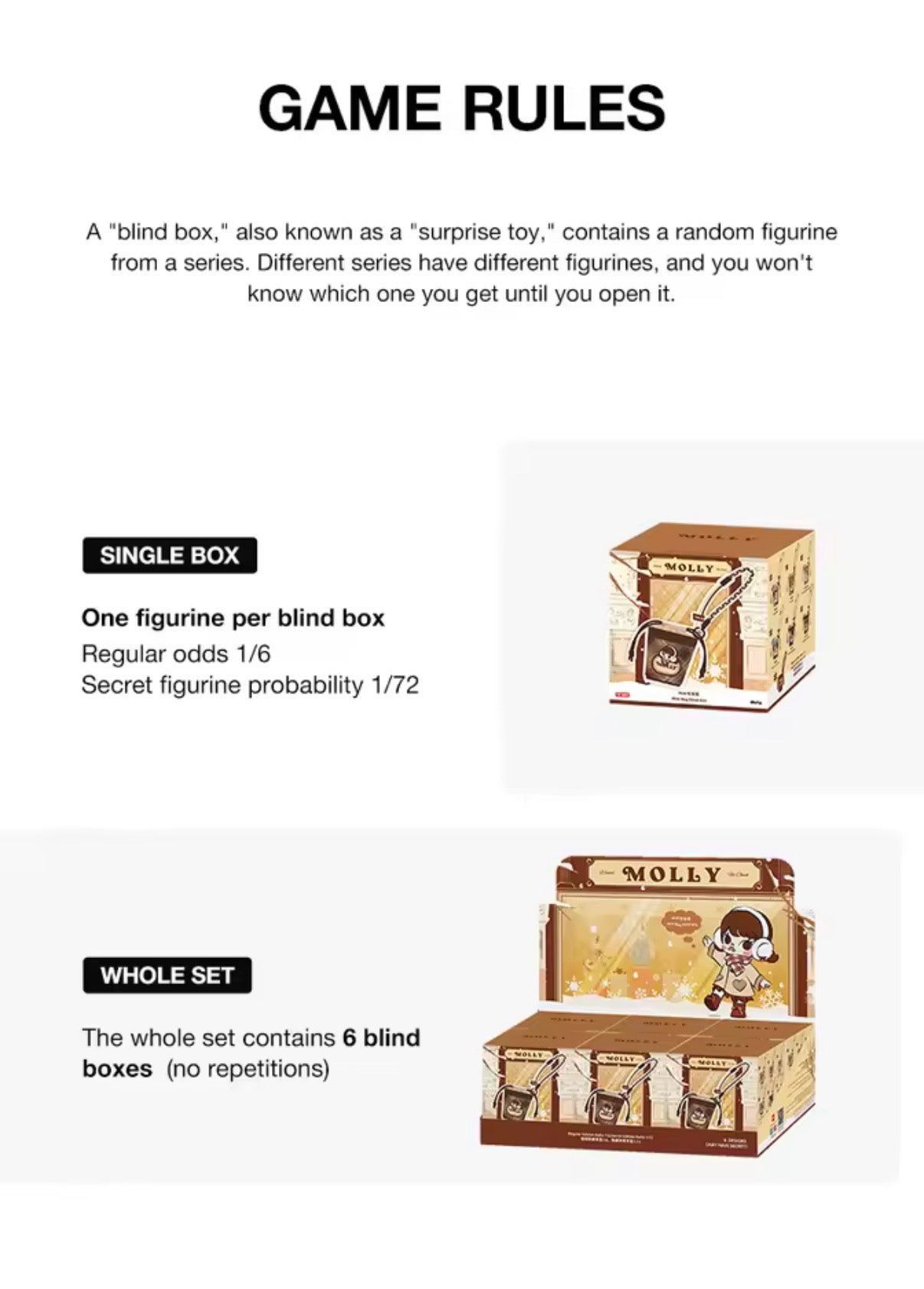„Blind box”, czyli tzw. „niespodzianka”, zawiera losową figurkę z danej serii. Różne serie mają różne figurki i nie wiesz, którą dostaniesz, dopóki nie otworzysz pudełka.