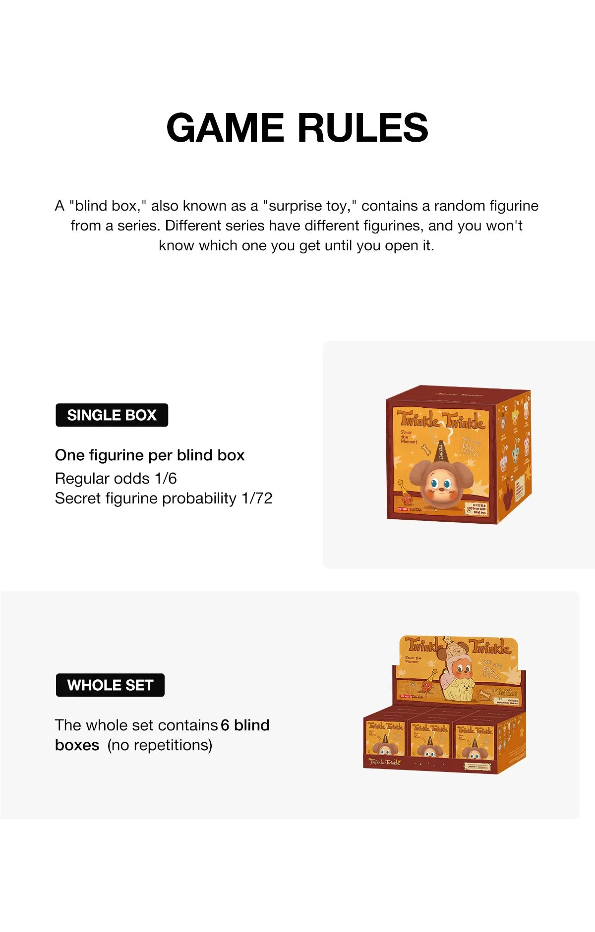 „Blind box”, znany również jako „niespodzianka”, zawiera losową figurkę z danej serii. Różne serie mają różne figurki i nie wiesz, którą otrzymasz, dopóki nie otworzysz pudełka.
